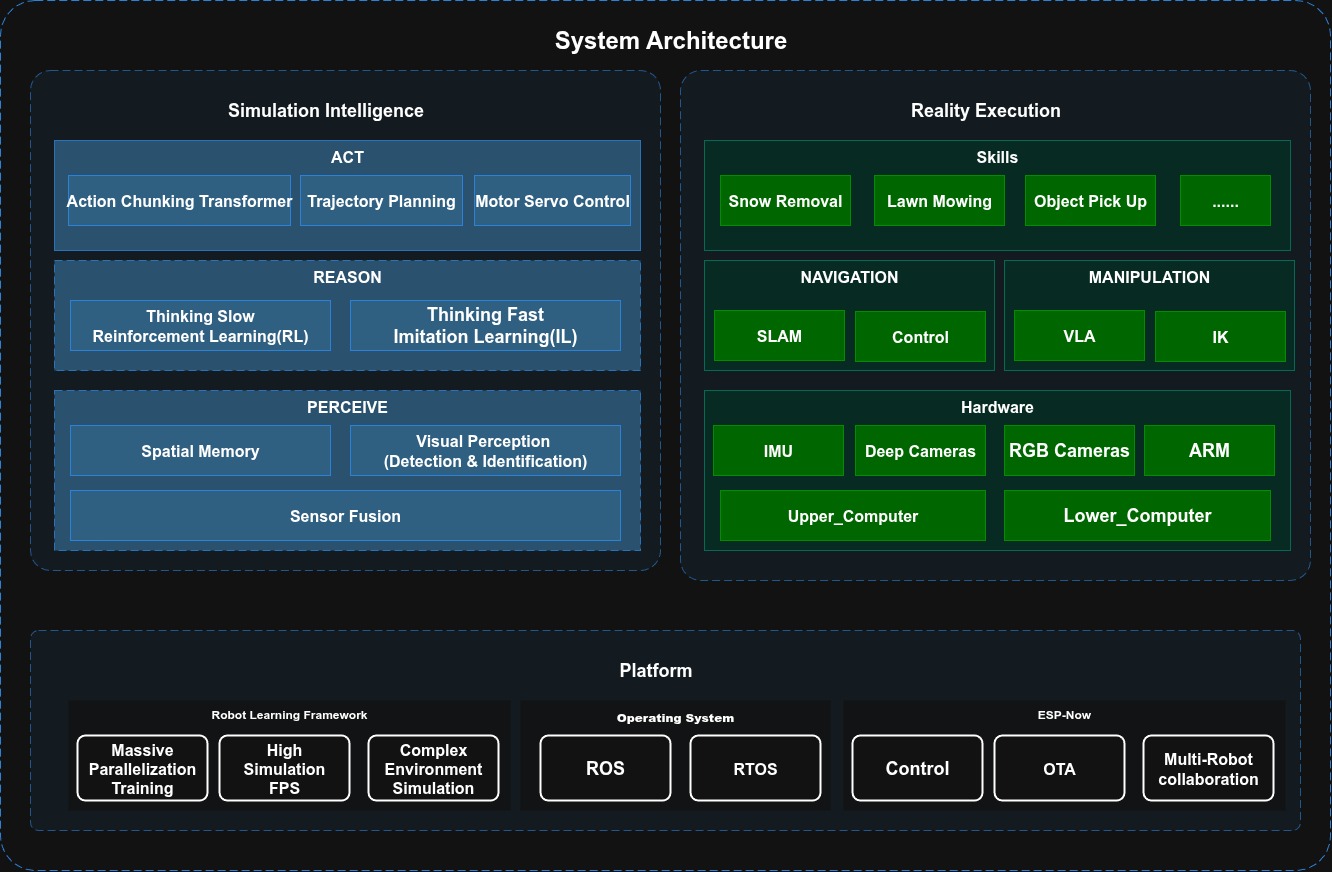 This architecture achieves a closed-loop between Simulation and Reality, where: